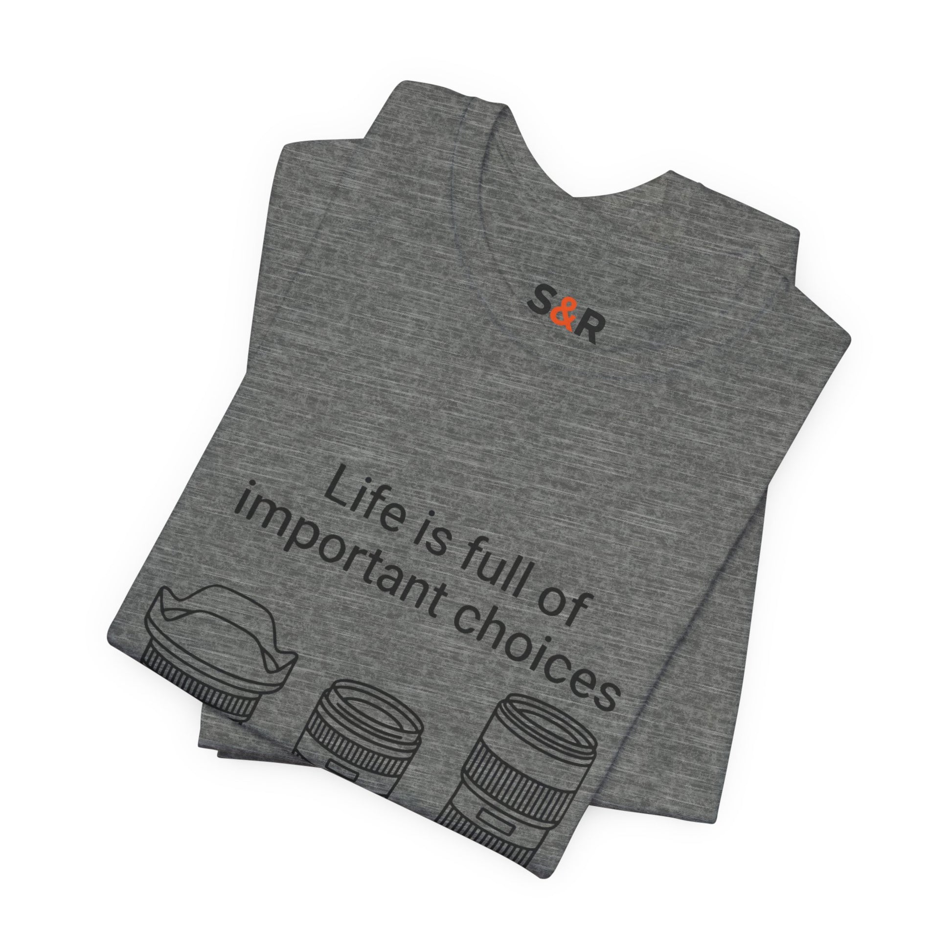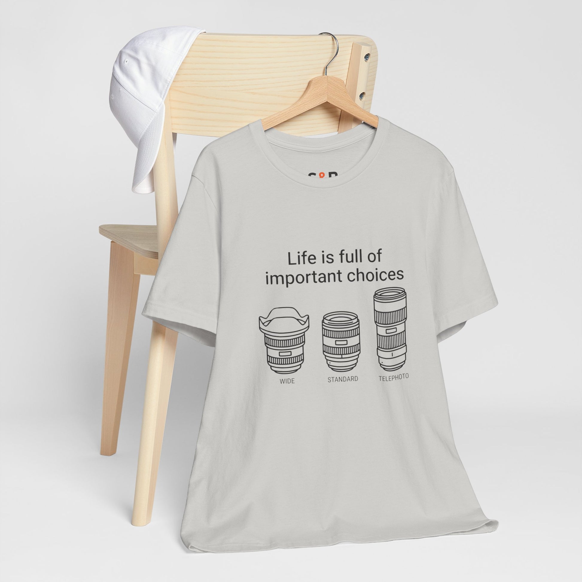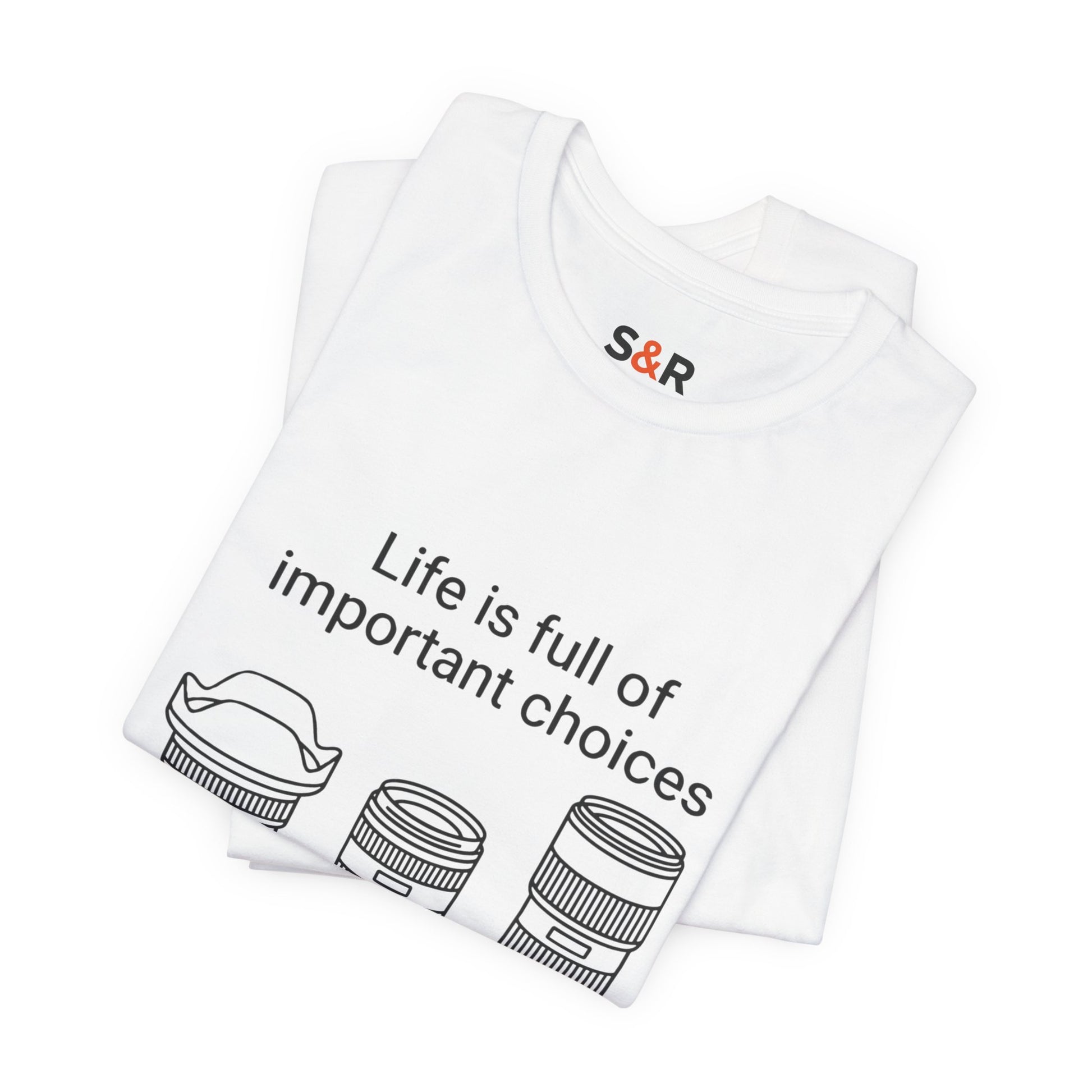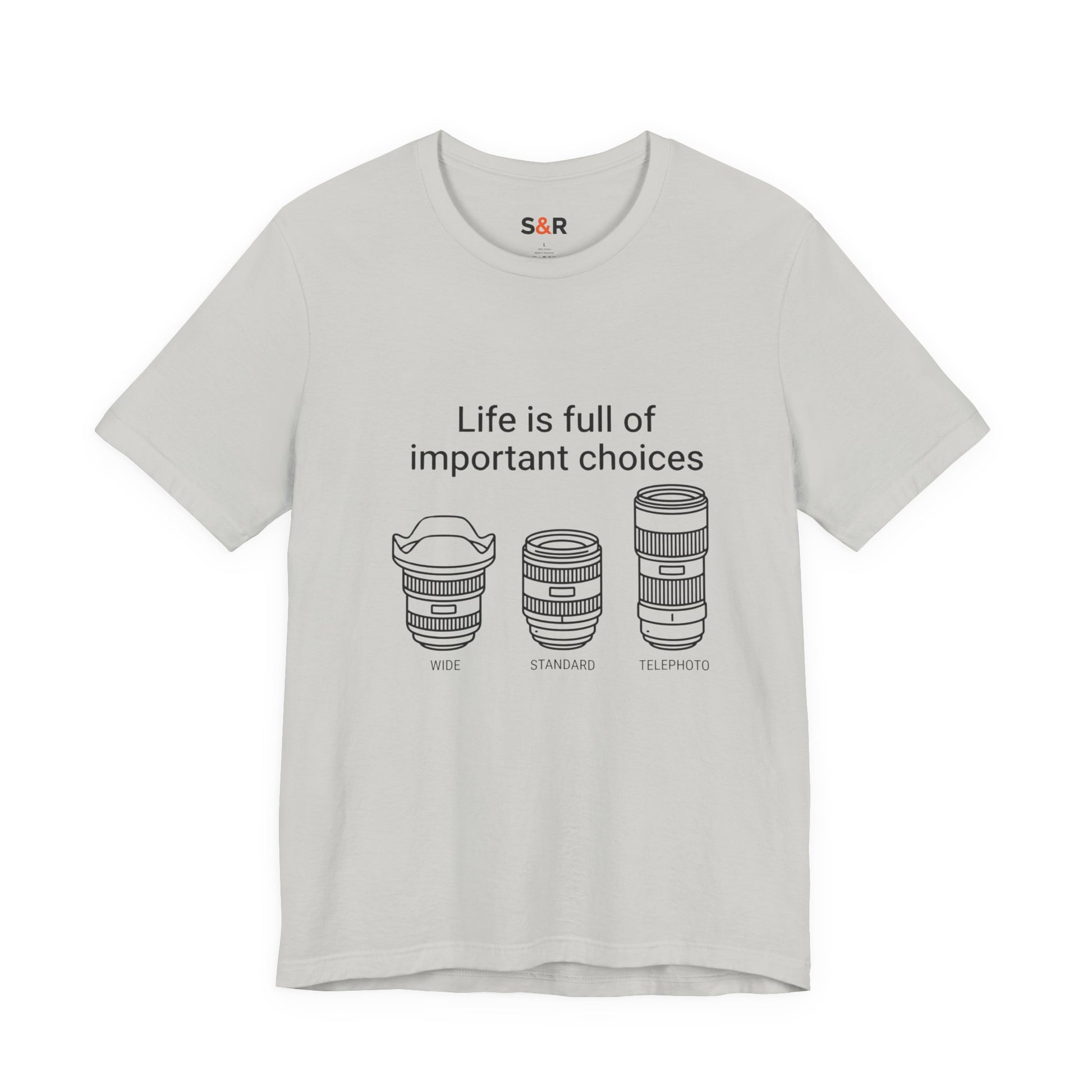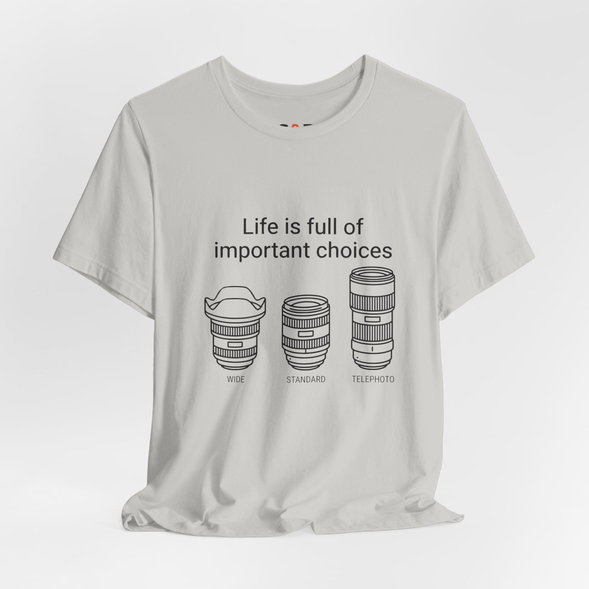 Photography Lens Tee — "Life is full of important choices" Graphic T‑Shirt