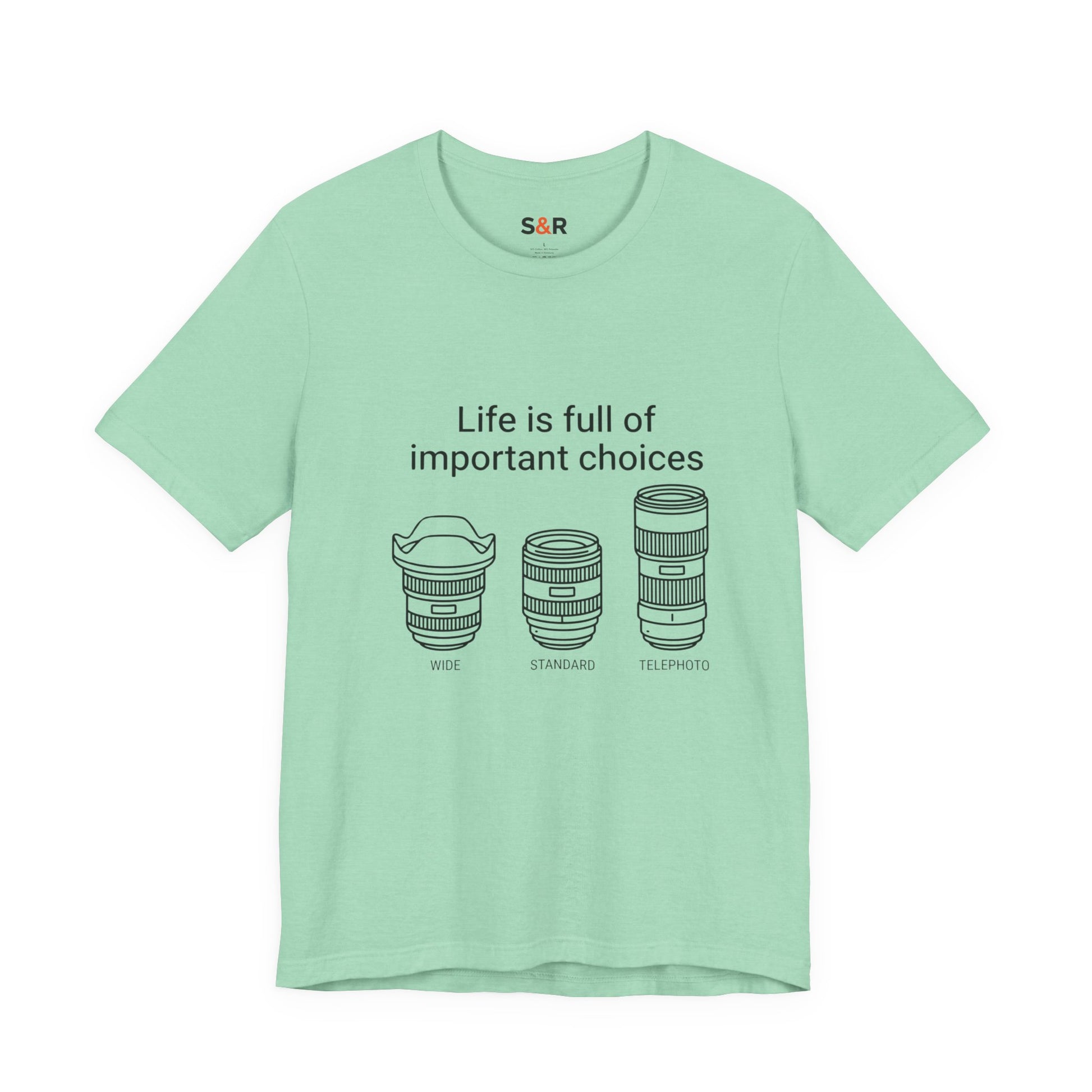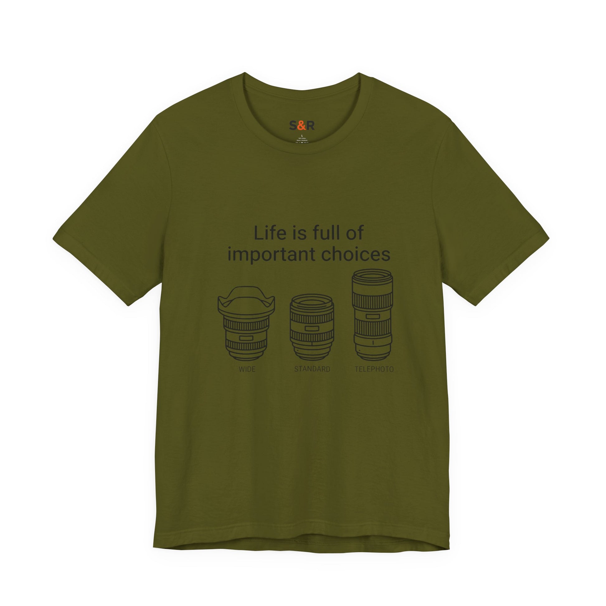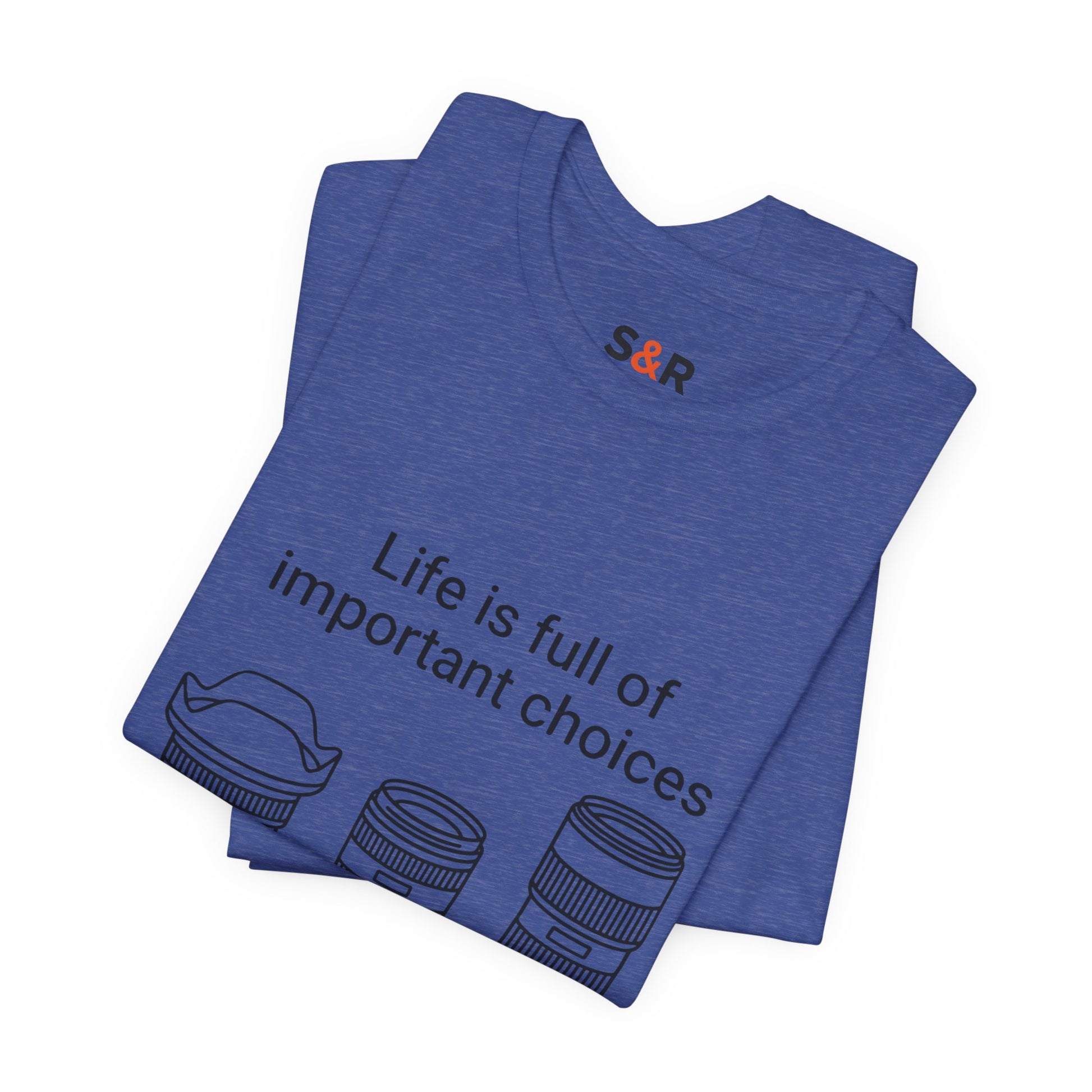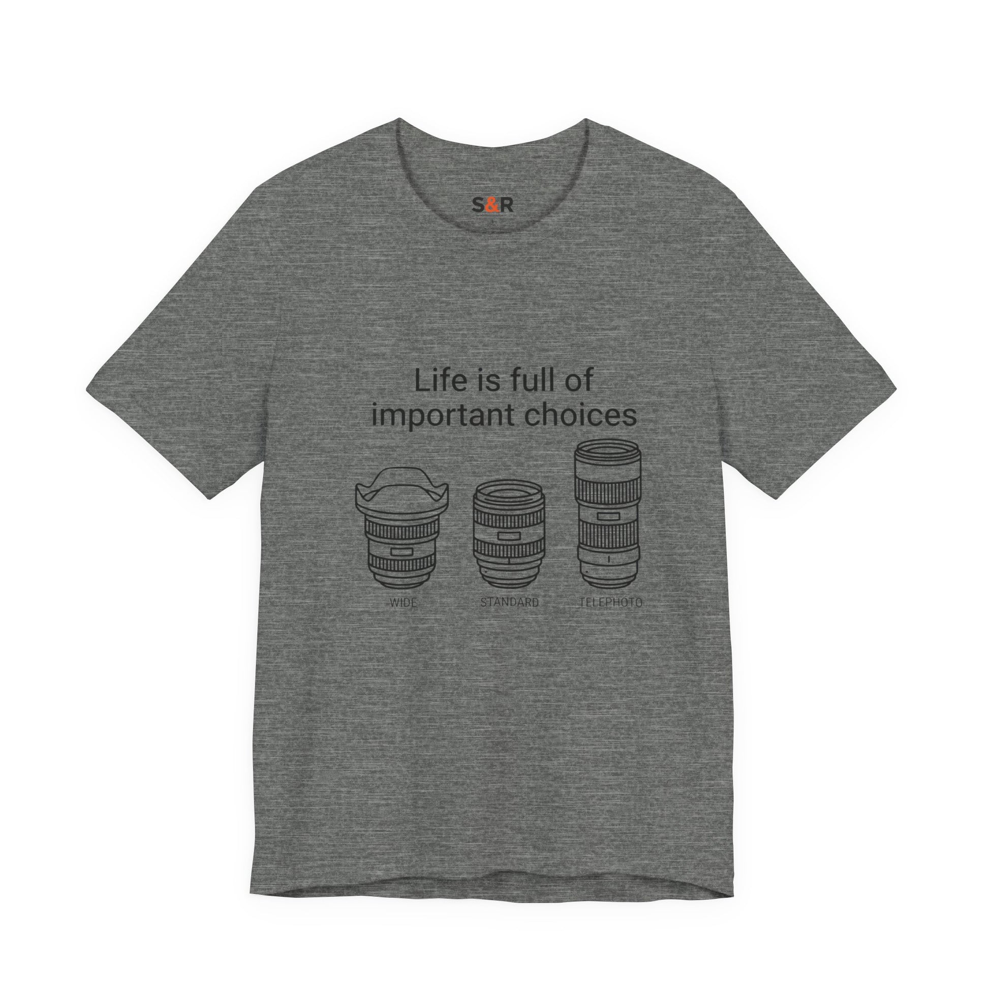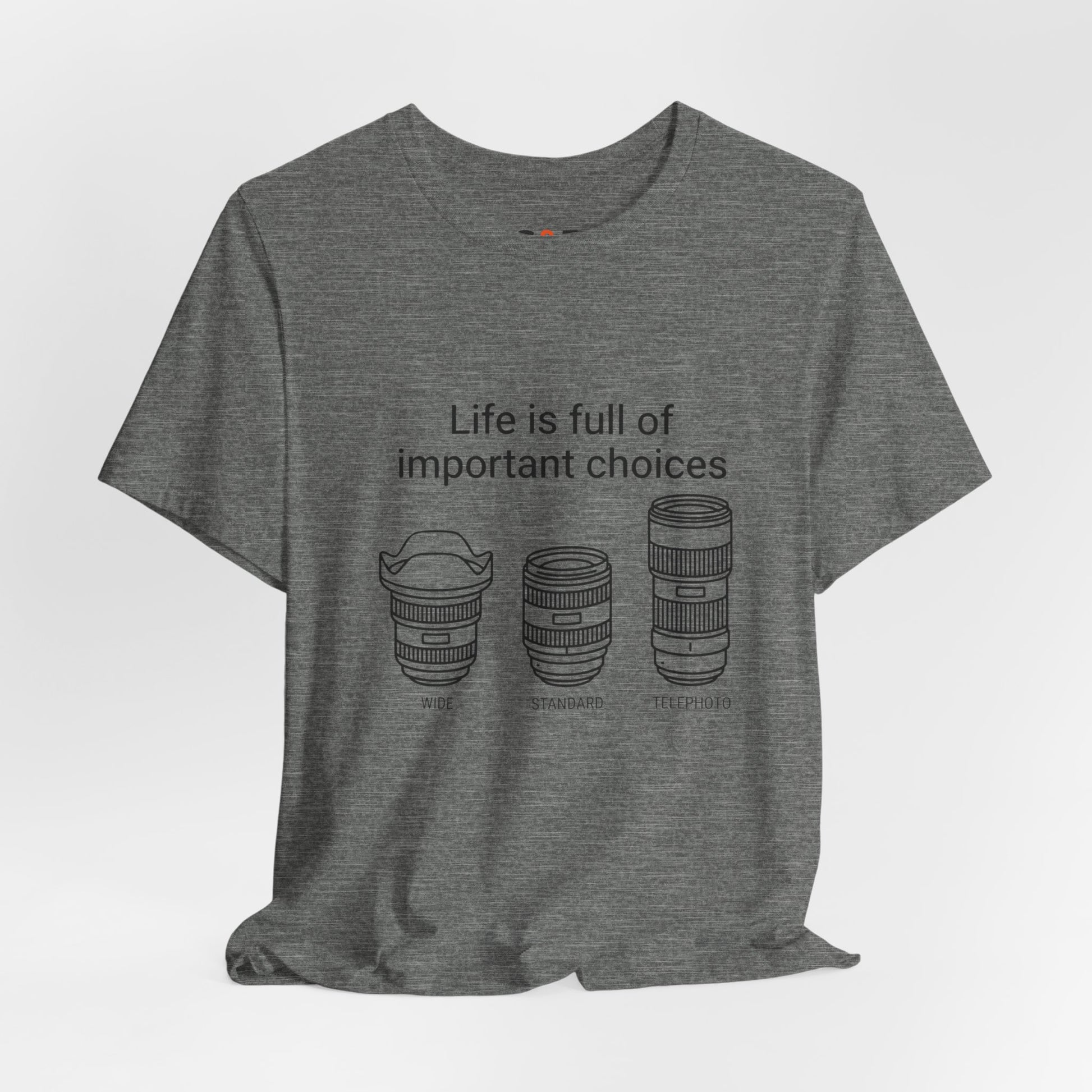 Photography Lens Tee — "Life is full of important choices" Graphic T‑Shirt