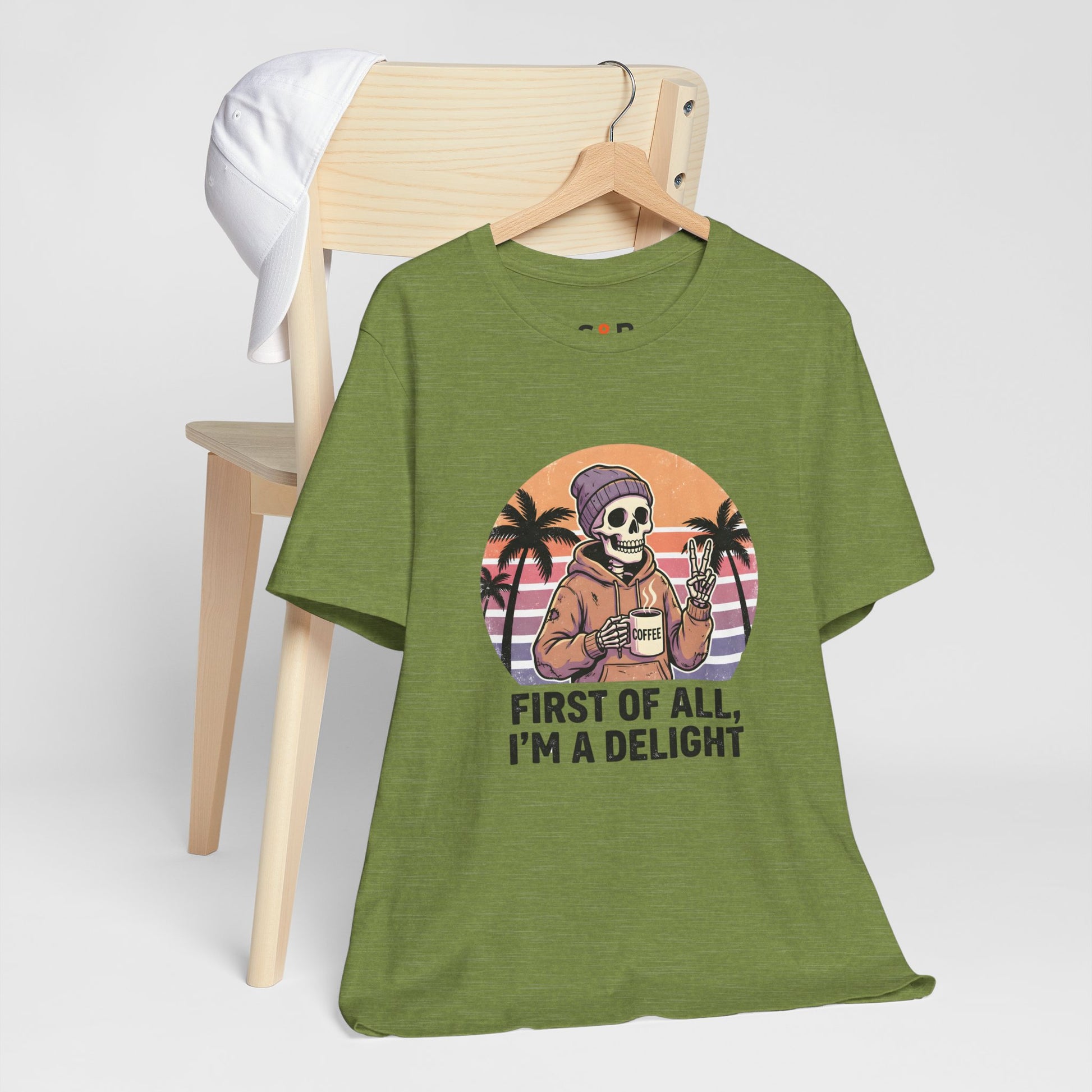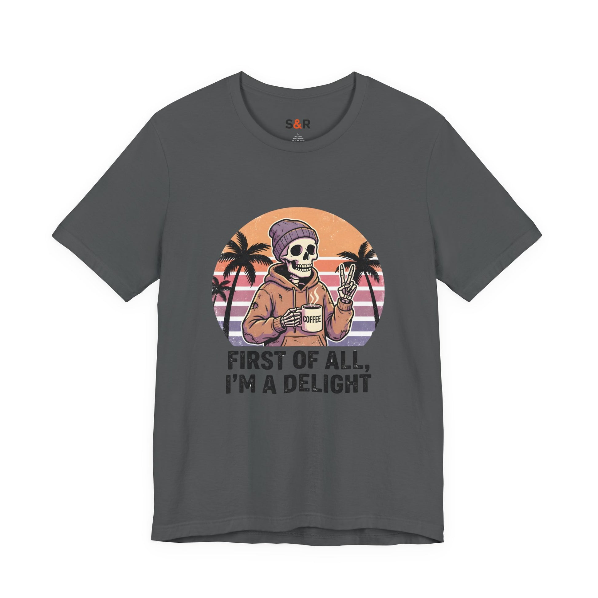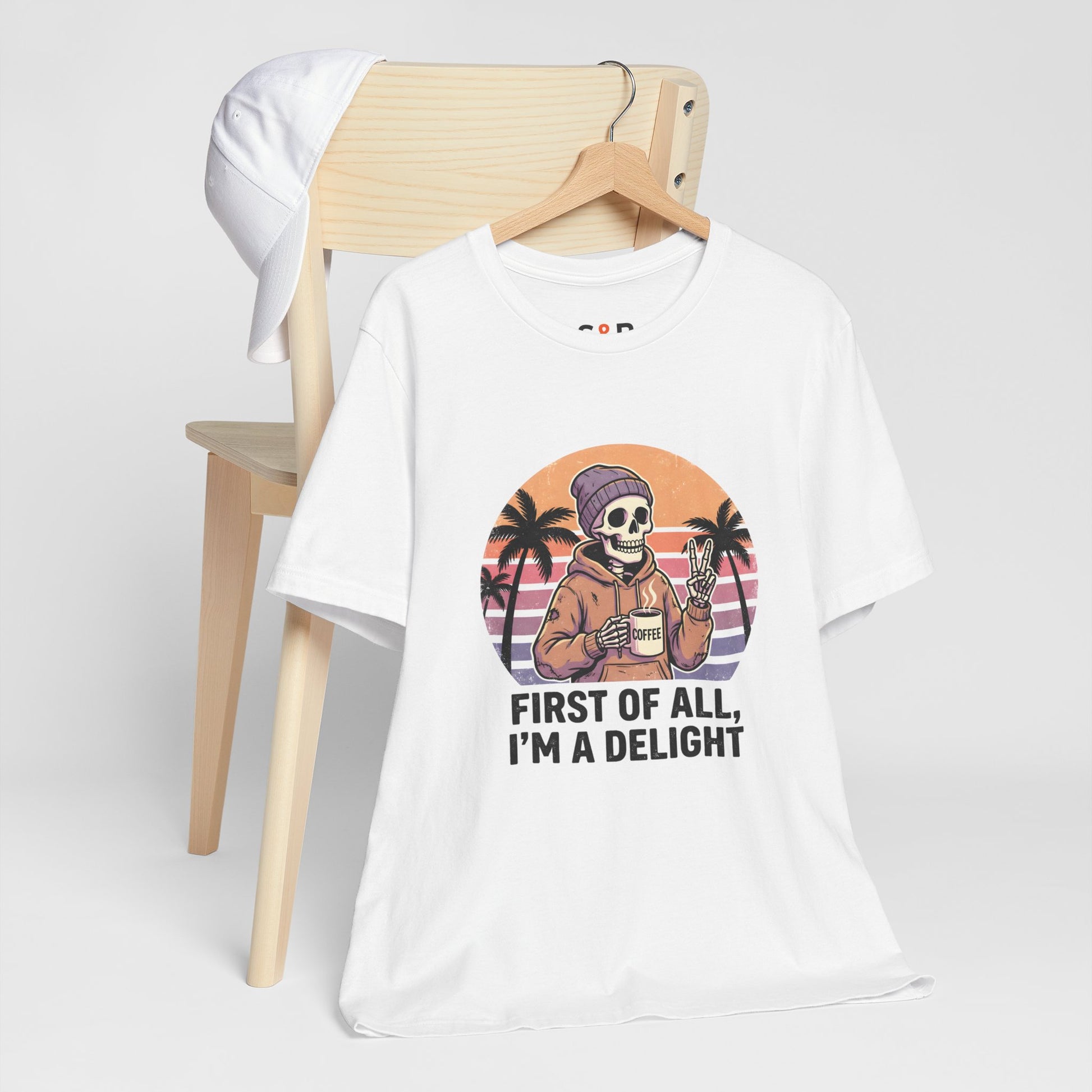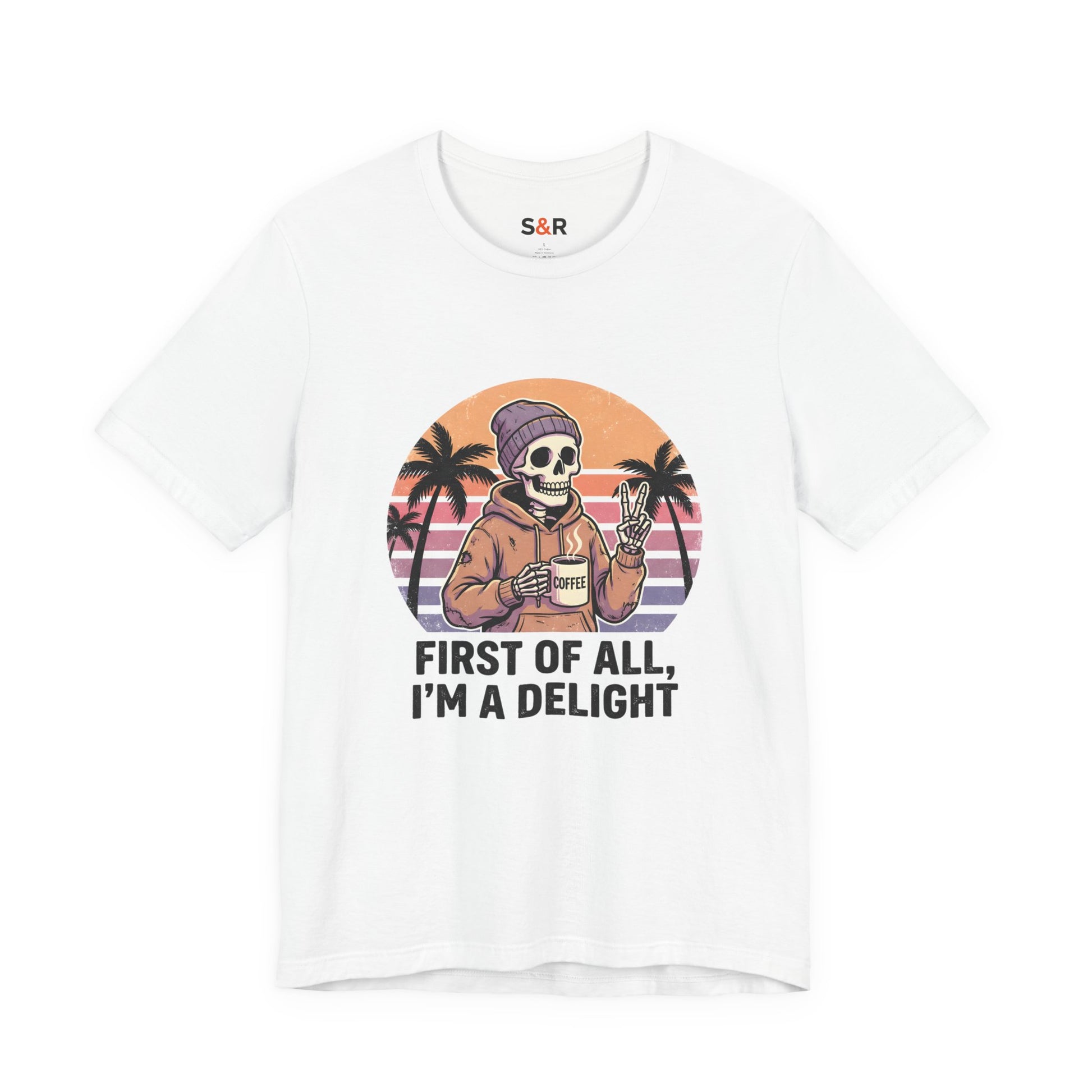 A lightweight, breathable tee that balances laid-back beach vibes with a darkly witty twist. The front print shows a cozy skeleton in a beanie and hoodie, holding a coffee against a retro sunset and palm trees—captioned “FIRST OF ALL, I’M A DELIGHT.” It feels like a late-morning stroll along the boardwalk after a long, honest conversation: warm, a little sardonic, and entirely comfortable. Wear it to small gatherings, coffee runs, or when you want a subtle, ironic statement that still reads calm and approachable. The retail cut and crew neckline keep the look tidy for layering or wearing solo, while the soft Airlume cotton keeps breathability high on warmer days.