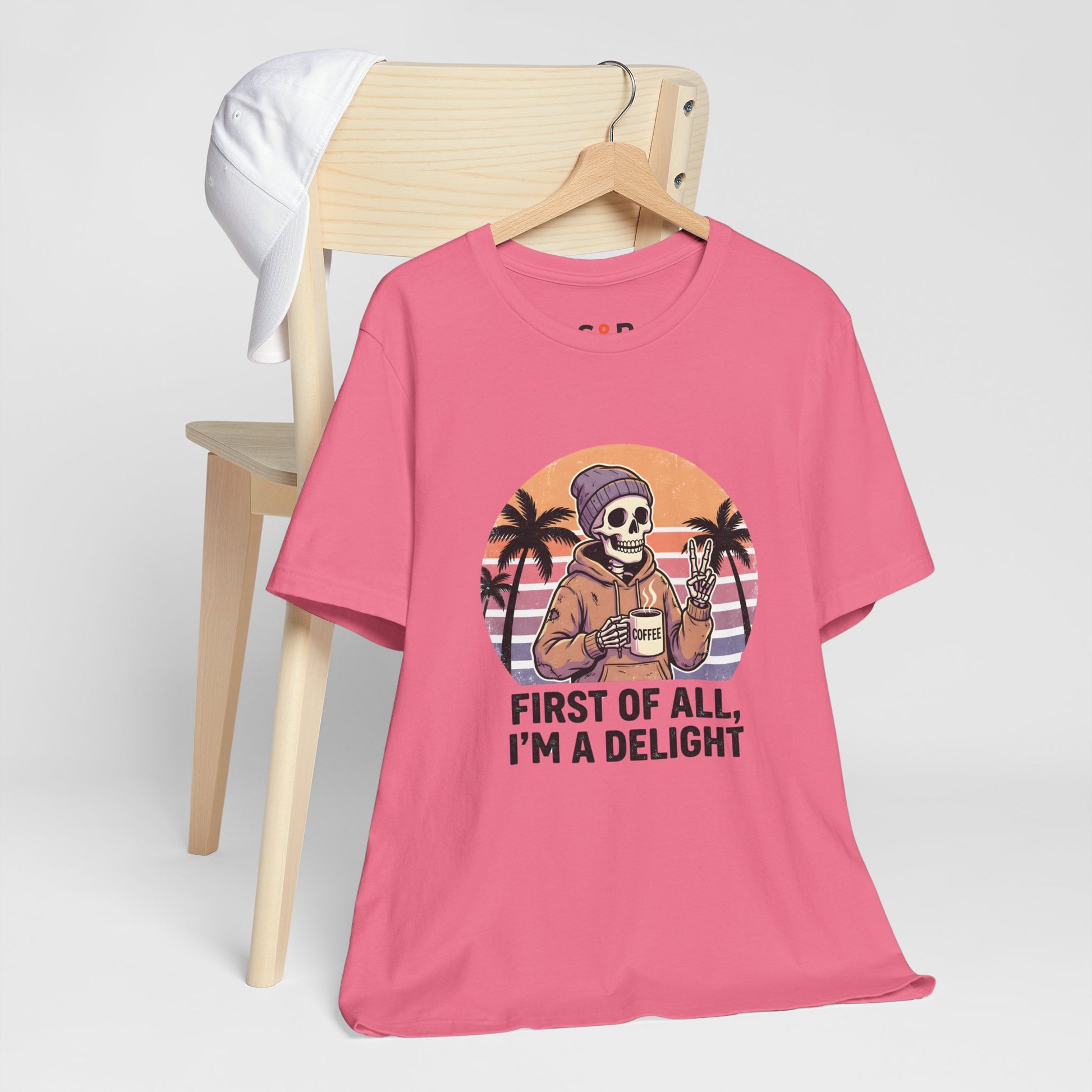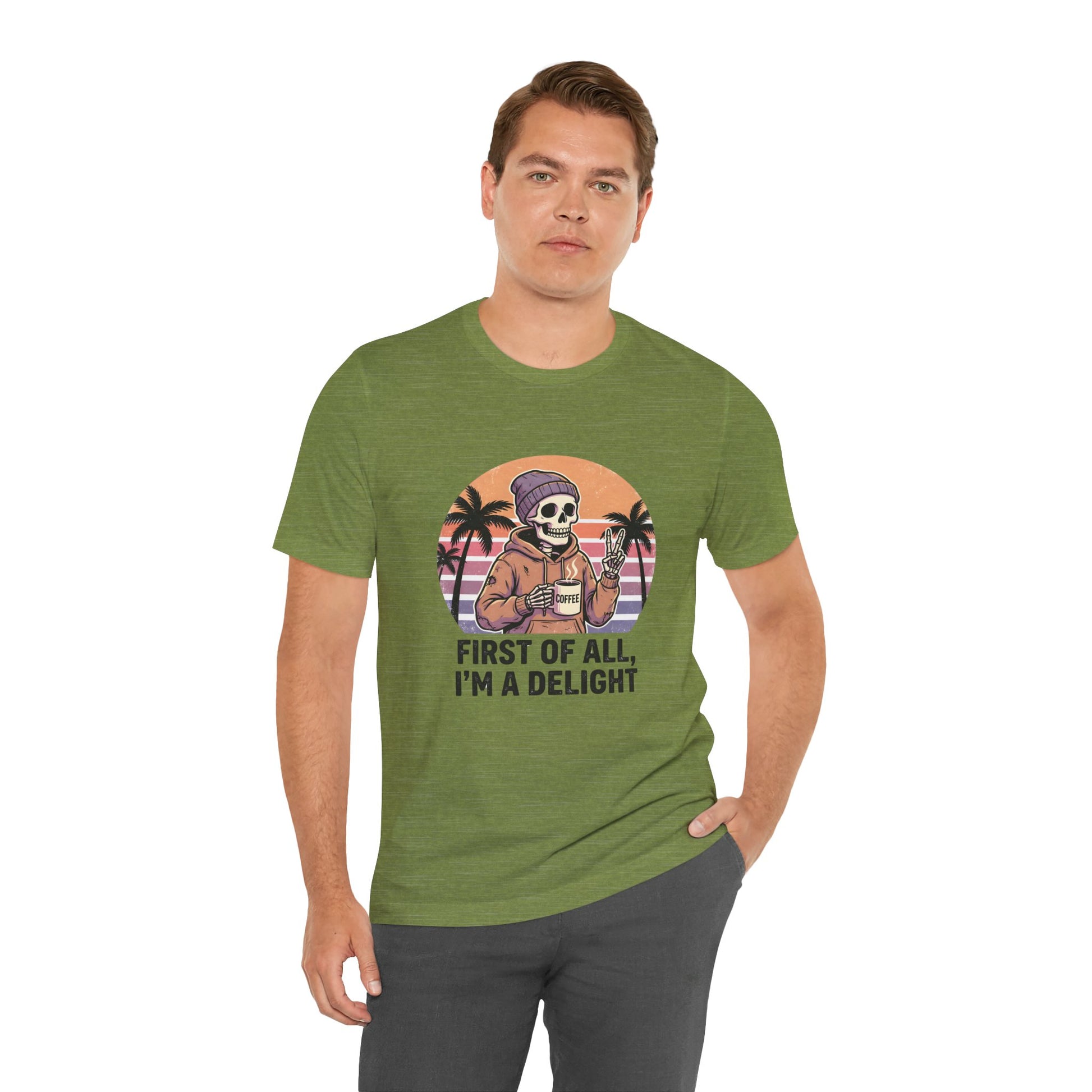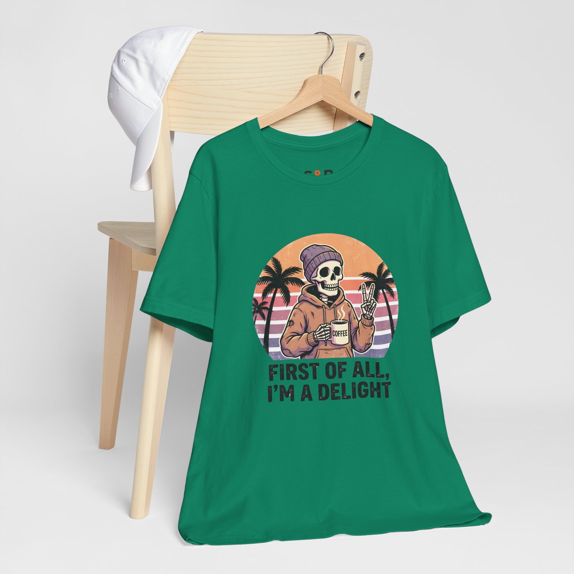A lightweight, breathable tee that balances laid-back beach vibes with a darkly witty twist. The front print shows a cozy skeleton in a beanie and hoodie, holding a coffee against a retro sunset and palm trees—captioned “FIRST OF ALL, I’M A DELIGHT.” It feels like a late-morning stroll along the boardwalk after a long, honest conversation: warm, a little sardonic, and entirely comfortable. Wear it to small gatherings, coffee runs, or when you want a subtle, ironic statement that still reads calm and approachable. The retail cut and crew neckline keep the look tidy for layering or wearing solo, while the soft Airlume cotton keeps breathability high on warmer days.