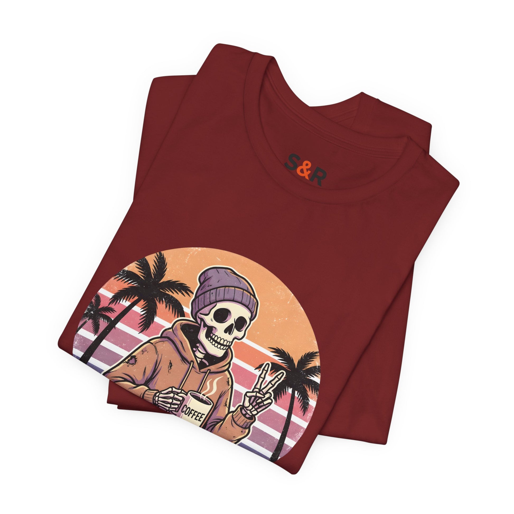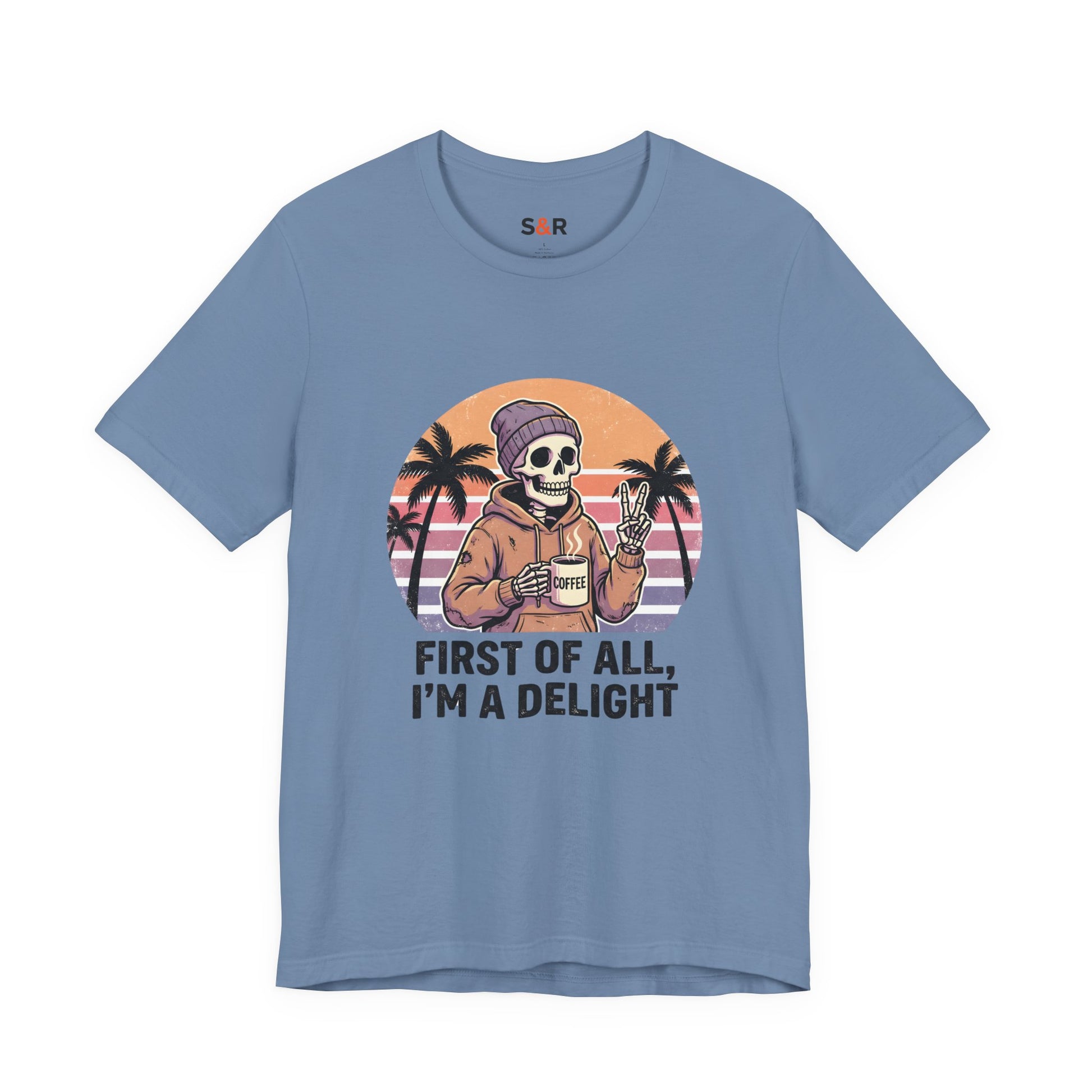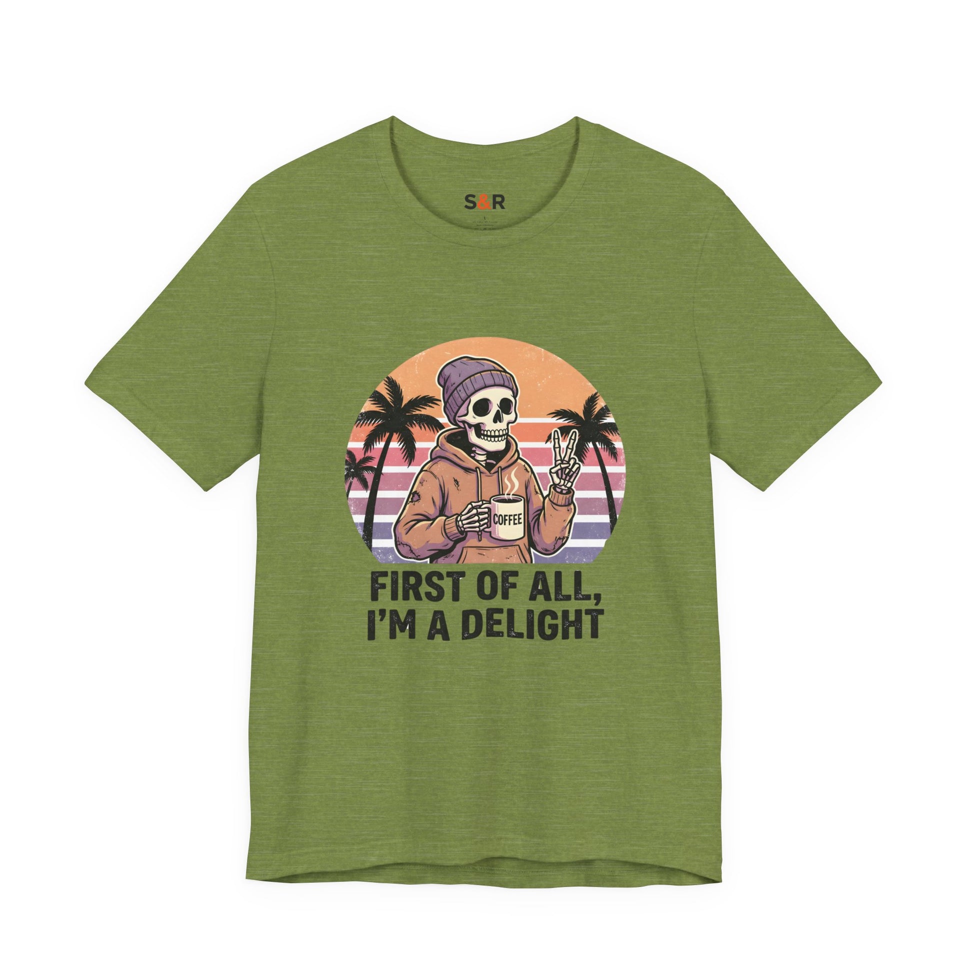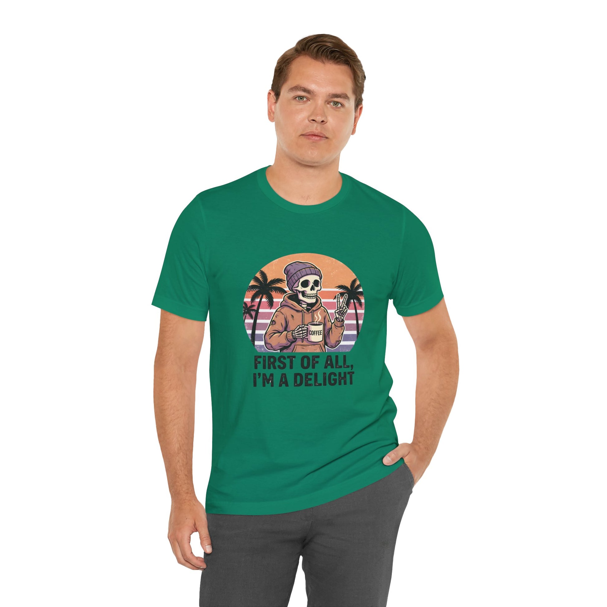 A lightweight, breathable tee that balances laid-back beach vibes with a darkly witty twist. The front print shows a cozy skeleton in a beanie and hoodie, holding a coffee against a retro sunset and palm trees—captioned “FIRST OF ALL, I’M A DELIGHT.” It feels like a late-morning stroll along the boardwalk after a long, honest conversation: warm, a little sardonic, and entirely comfortable. Wear it to small gatherings, coffee runs, or when you want a subtle, ironic statement that still reads calm and approachable. The retail cut and crew neckline keep the look tidy for layering or wearing solo, while the soft Airlume cotton keeps breathability high on warmer days.