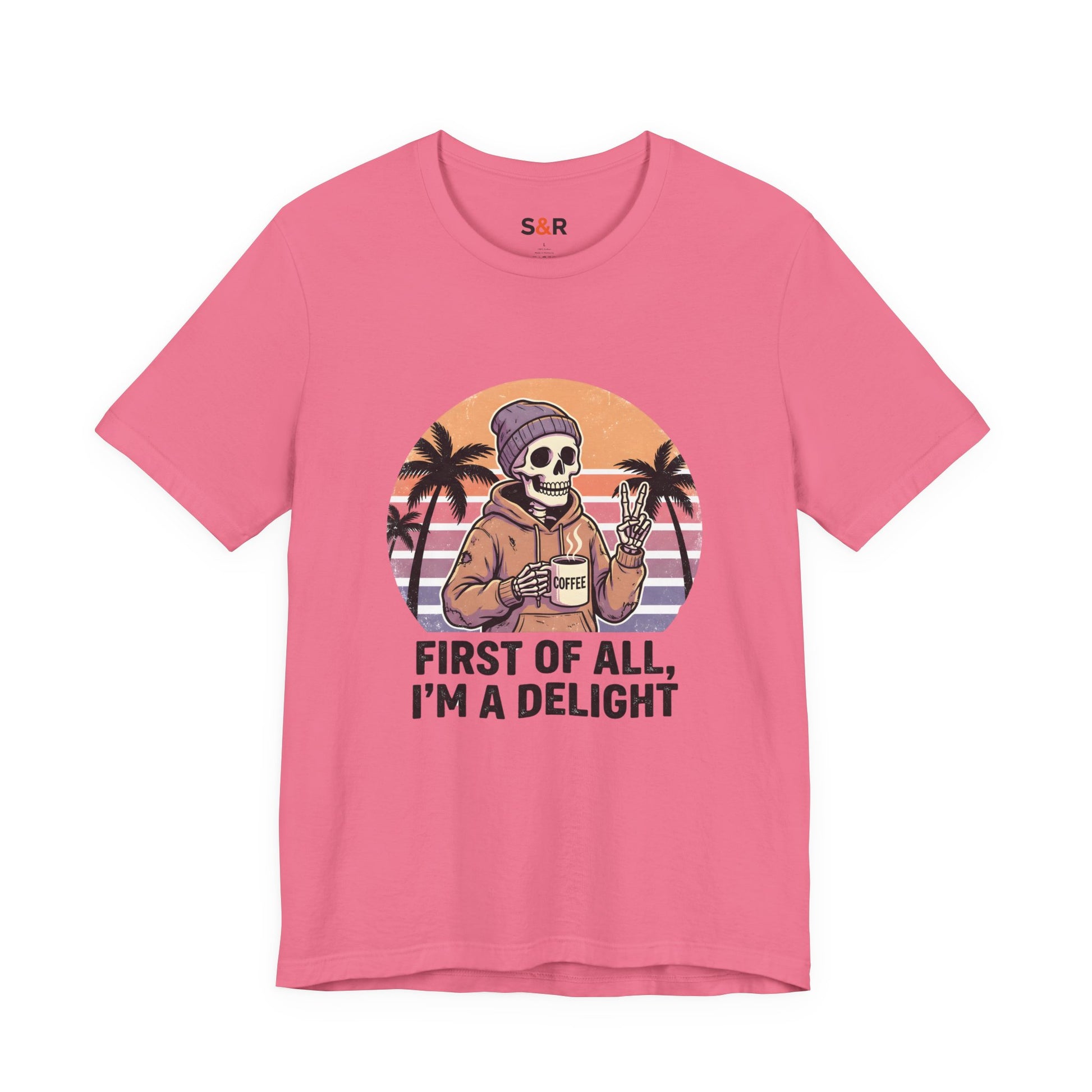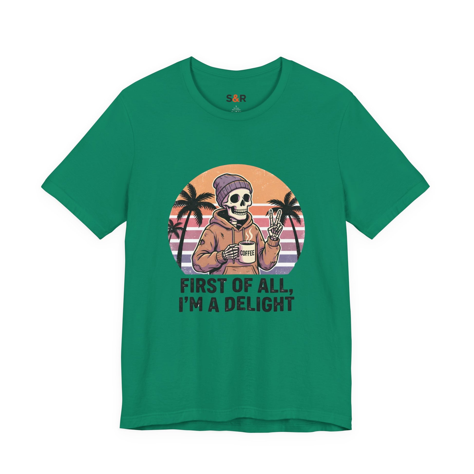 Skull Chill Tee – "First of All, I’m a Delight" Retro Palm Graphic T‑Shirt
